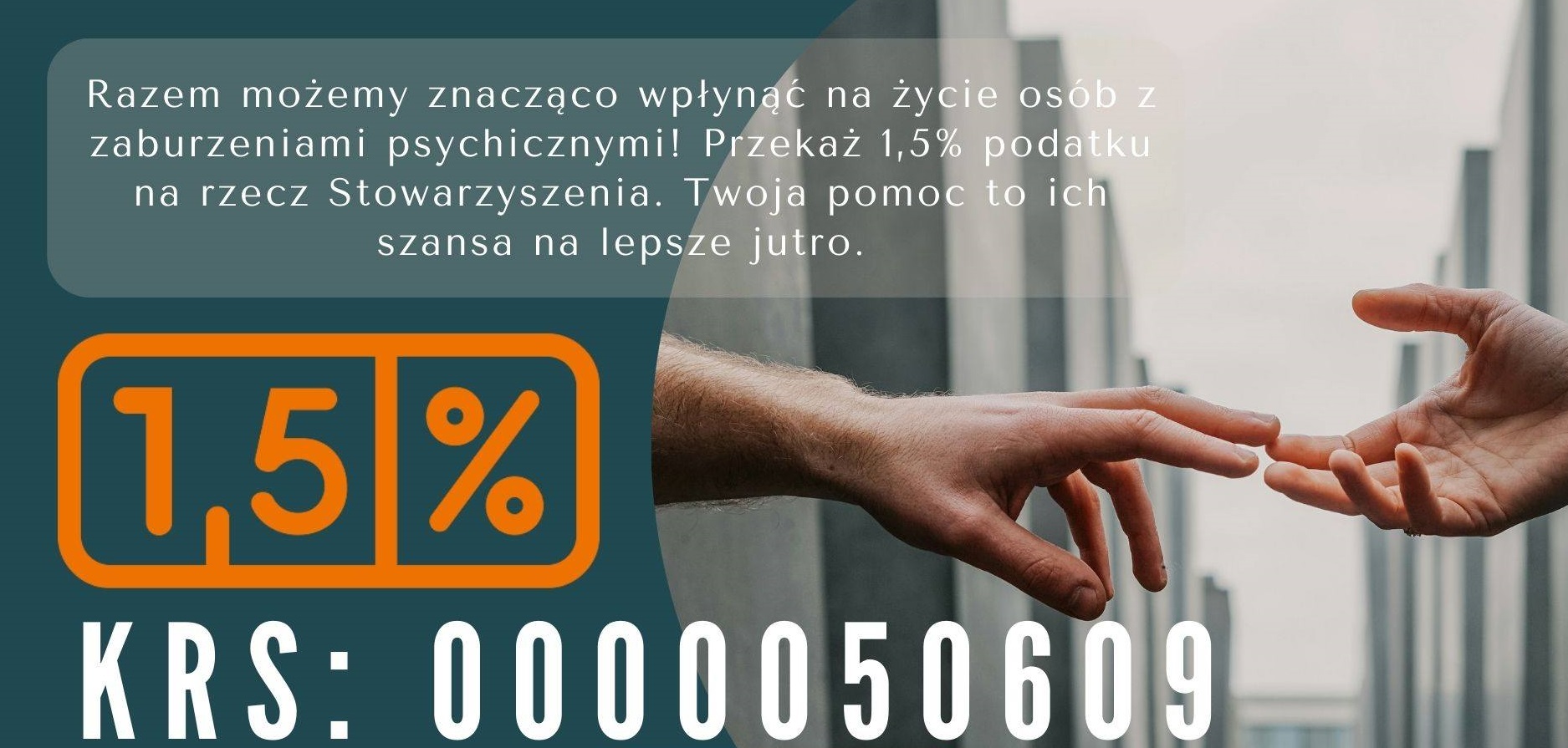 Razem możemy znacząco wpłynąć na życie osób z zaburzeniami psychicznymi. Przekaż 1,5% podatku na rzecz Stowarzyszenia. Twoja pomoc to ich szansa na lepsze jutro.